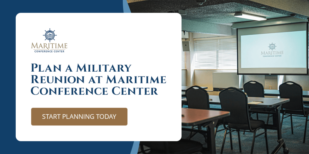 Discover our exceptional military reunion space to host our gathering. The Maritime Conference Center is an all-in-one event venue and hotel. Our space accommodates your overnight guests for optimum comfort throughout the reunion. There are two areas to host the event. The auditorium holds over 280 guests, and the memorabilia room includes items of particular interest to the Navy, Marine Corps and Coast Guard.